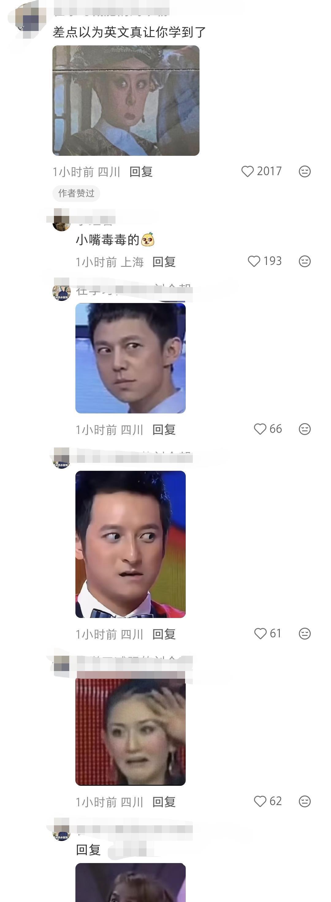 值得注意的是,他还点赞了一个网友的评论——“差点以为英文真让你学到了”。有意思的是,这条评论下面的表情包都是他的老朋友,哈哈哈。