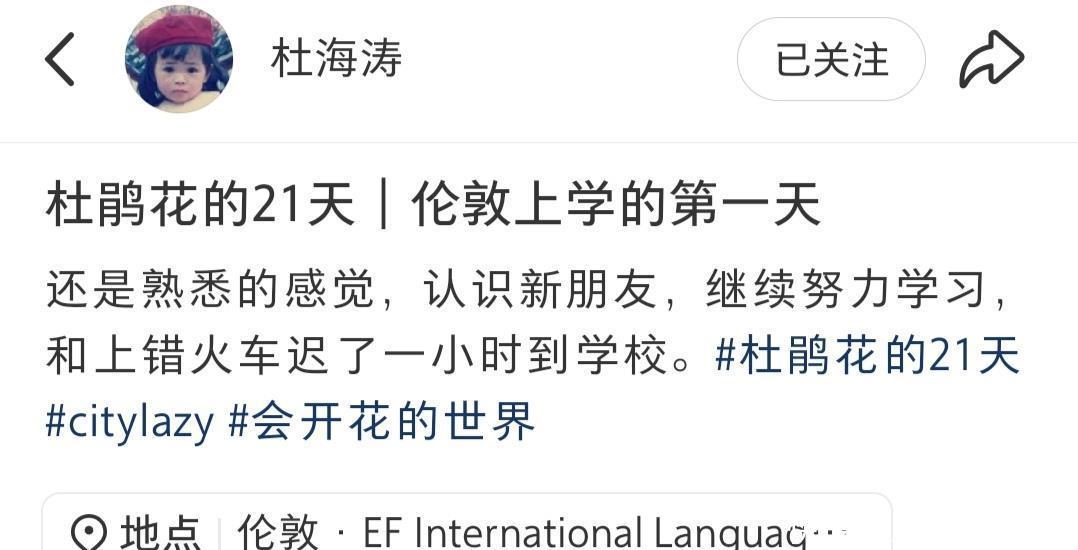 上个月,主持人杜海涛开启了英国读书之旅,时长天。据说,他上课的时间比较自由,半天学语言(英语),半天自己安排课余生活,可以参加校内活动,也可以到处逛。